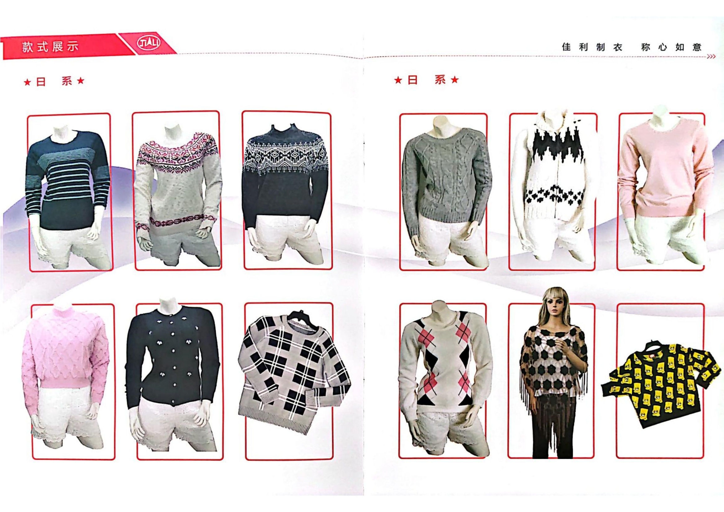山東省乳山市佳利制股份有限公司于2001年2月成立,位于乳山市城區(qū)工業(yè)園營(yíng)口路。現(xiàn)有從業(yè)人員260人,其中男性100人,女性160人。固定資產(chǎn)5000萬(wàn)元,占地22000㎡,建筑面積13800㎡。主要生產(chǎn)各種針型的毛衫及手鉤、刺繡等工藝服裝,針織、梭織面料服裝,主要銷往日本、美國(guó)、意大利、英國(guó)等幾十個(gè)國(guó)家和地區(qū)。